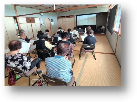 亀山社協の会長より、亀山の歴史を学びふるさを知る「亀山かるた」、亀山小学校の歴史を知る「紙芝居 私たちの亀山小学校」の紹介があり、スクリーンで鑑賞しました。地域の歴史や子どもたちの活躍に、参加者の皆さんも昔の出来事や時代に思いを巡らせておられました。