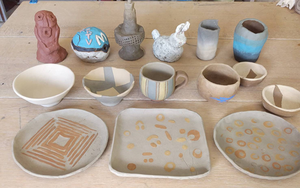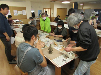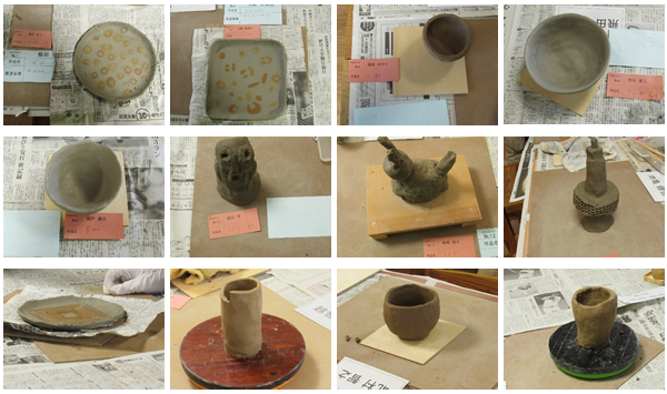 受講者は「板作り」でお皿作りをするグループ、「ひも作り」でカップやお茶碗類、花瓶作りをするグループ、「はにわ」や動物、ゲームのキャラクターの置物等を作る三つのグループに分かれ、皆さん楽しく作品作りに取り組みました。途中、思うように行かず苦心する人もいましたが、中嶋先生の丁寧な指導のお蔭で全員が作品を完成させることができ、どれも個性あふれる素敵な作品に仕上がりました。