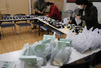 平田中地区でふれあいサロン会を開催しました。今年度は新型コロナの感染が拡大していたため、対象者(80歳以上の方及び70歳以上の独居者)117名の方々への 記念品の配付と致しました。記念品は上生菓子とマドレーヌのセットです。