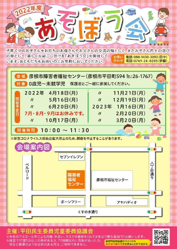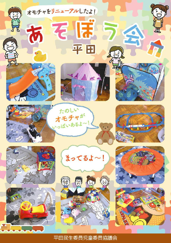あそぼう会の案内チラシを作成しました。今年度(2022.R4)の開催予定や会場案内図、 遊具・おもちゃを一新したことなどを掲載しています。