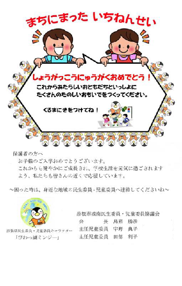 今年、入学した106名の児童へのお祝いと激励を兼ねて3教室を訪問しました。民児協会長から日頃の「民生委員児童委員活動」の紹介や児童へのお祝いのメッセージ、 登下校時の注意事項、多くの友達をつくり仲良く楽しい学校生活を送れるようアドバイスしました。 それぞれの学級代表児童に動物絵柄入りノ-ト、 保護者の方へのメッセージ文とびわっ湖ミンジ―で創作した学校周辺地図を添えて贈呈しました。