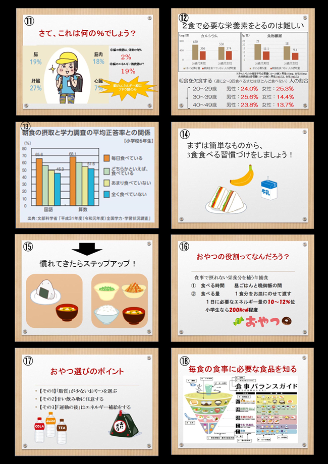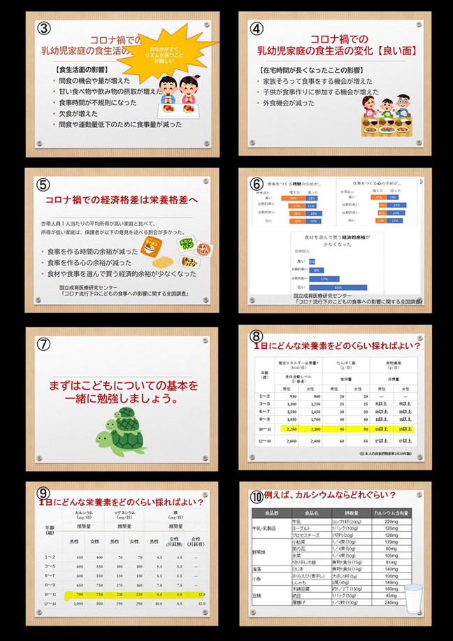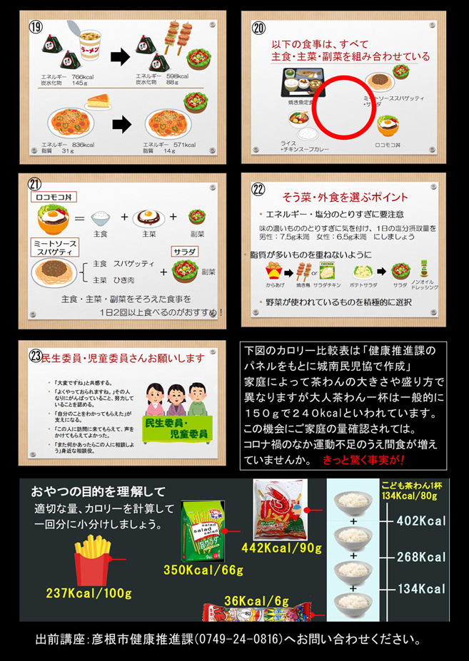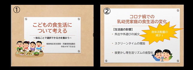 コロナ禍における食生活の変化がもたらす問題やこどもの基本的な食生活を一緒に勉強しました。 摂取する栄養量、欠食(朝食)を補う栄養摂取の難しさ、欠食による学力低下、1日3食の習慣の重要性、 おやつとご飯のカロリー比較では認識差異に思わず絶句、続いて望ましい食事の組み合わせ「ロコモコ丼」紹介等々で食を通しての意識の向上。 知ることで選択できる力が養えた研修会でした。