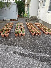 7月中に、プランターを城西学区内の各所(キャッスルロード沿い、 本町二丁目交差点、城西小学校北門、福祉施設3ケ所 他)へ移動させます。 「花づくり」を通じて、地域住民の交流の場づくりにつなげていきます。