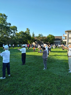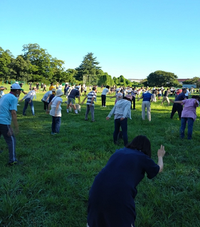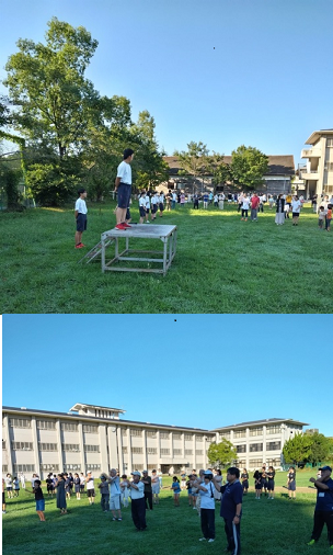 お盆を過ぎても暑くむしむしする朝でしたが、朝早くから約230名もの生徒と地域住民が参加されました。 特別ゲストとして「わるにゃんこ将軍」が一緒にラジオ体操をしていただき和やかなラジオ体操になりました。