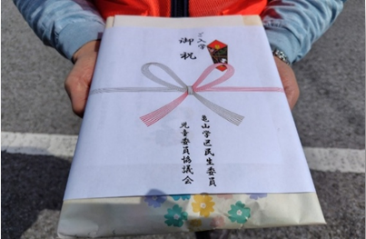 各担当の民生委員児童委員からお祝いの気持ちを伝え、ささやかなプレゼント(文房具)をお届けしました。楽しい学校生活が送れますように願っています。
