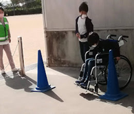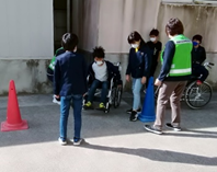 3人1組になり登り坂や下り坂・障害物をよける・狭い道を通る・砂利道・側溝・段差など様々な状況で、実体験しました。