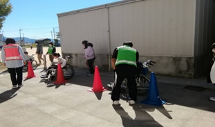 児童達は、3人1組になり登り坂下り坂、障害物をよける、狭い道を通る、砂利道、 側溝、段差な状況のミニコースで実体験しました。