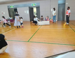 西畑由美子先生の指導のもと、親子でリズム体操やミニ障害物レースをしました。 子どもたちは飛んだり走ったり潜ったり大はしゃぎでした。