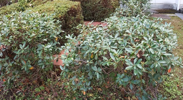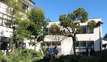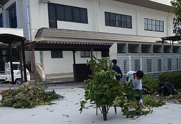 担当職員の朝の挨拶 生徒も両手ハサミを使って、一生懸命に葉刈りをしています。
