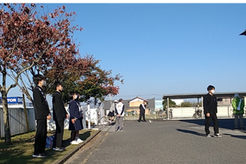 晴天に恵まれた、早朝 自転車や徒歩で通学してくる生徒を 先生や生徒の代表で出迎えました。 一人一人に「おはよう」と声掛けすると 元気よく、「おはようございます」の声が 返ってきます。 |