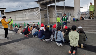 本日の行動予定を民生委員~聞く児童たち 駒回しのやり方を民生委員が説明