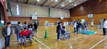 民生委員の指導を受けて車椅子を押している 体育館の中でも車椅子体験をしました