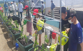 栽培委託した農家さんが育てたゴーヤと朝顔の苗を、生徒とボランティアの皆さんでプランターに植込み