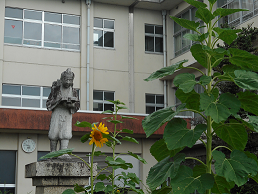 校舎の中に二宮金次郎の銅像が ありますが、その前にヒマワリ の花が誇らしげに咲いてます。 ~金次郎さんみたいに 私も僕も勉強したいわ(^^)/~ |