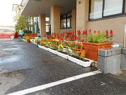 正面玄関前には、マリーゴールド、 サルビア等が賑やかに咲き誇っています。 |
