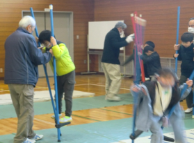 かんぽっくりのやり方を聞く児童たち 竹馬、練習中の児童たち