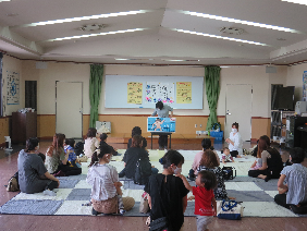 慣れるまでは、お母さんにひっついたまま、また、お兄さんだとばかり、 あっちこっちと駆け巡る男の子、そしておとなしそうな子、と様々でしたが、 みんな打ち解け、絵本聞かせ、はいはい運動、親子体操など、1時間半の広場を楽しんでいるようでした。