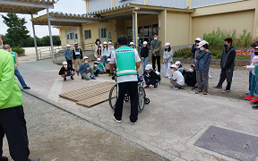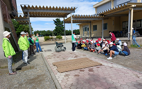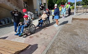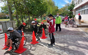 彦根市身体障害者更生会の方々の指導の下、3人ひと組に1台の車椅子があてがわれ、児童らは、 乗り手、介助役の役割を順番に交代しながら、車椅子操作を体験していました。ブレーキの解除、スロープは後ろ向きに、 段差は車のリンクを使用しながら押し上げて、そして、自分で車を回しながら前進し、 片方の車の回転を止めながらカーブしていく、みんな楽しそうに操作していました。最後の砂利道では、 車の前進がうまくいかず、車椅子の大変さを体感していました。 民生委員児童委員も、児童らの操作を手助けしながら、車椅子操作の確認をしていました。