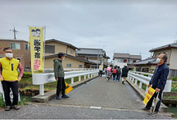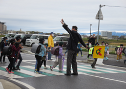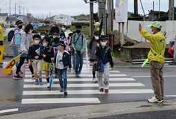 金城学区では、春の交通安全運動に合わせ、4月8日(金)、11日、13日、15日の4日間、 小、中学生の通学路の28か所の地点において、地域の方々と子ども達のあいさつ運動が行われました。 民生委員もそれぞれの地点に立ち、“愛の声掛け運動” に参加しました。 新1年生(小学校)も重い鞄を背負いながら、子どもたちの列の真ん中で、守られながら、 通学していました。
